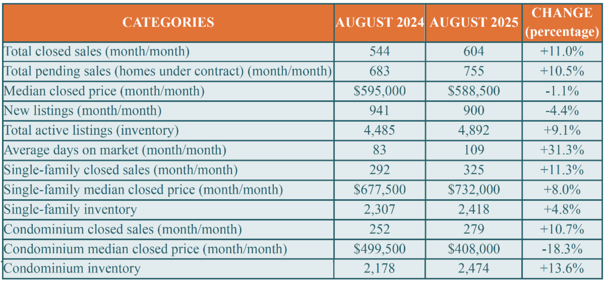 August 2025 compared to August 2024 showed that new listings rose from 4,516 to 5,024 (+11.3%), and pending sales increased from 3,132 to 3,530 (+12.7%), while closed sales declined from 2,965 to 2,627 (−11.4%). Inventory finished at 1,725 homes (+22.1% year-over-year), with 9.5 months supply. Sellers received 94.2% of list price on average. Single- family homes posted a median sales price of $415,000 (DOM 58.5) versus $418,000 last August, while condos recorded a median sales price of $335,000 (DOM 105) versus $390,000. Year-to-date through August, closed sales are 24,118 vs 27,114 (−11.1%), new listings are 48,882 vs 47,400 (+3.1%), YTD median sales price is $368,410 vs $370,000 (−0.4%), pending sales are 20,778 vs 22,766 (−8.7%), and median days to contract lengthened to 58 from 45.